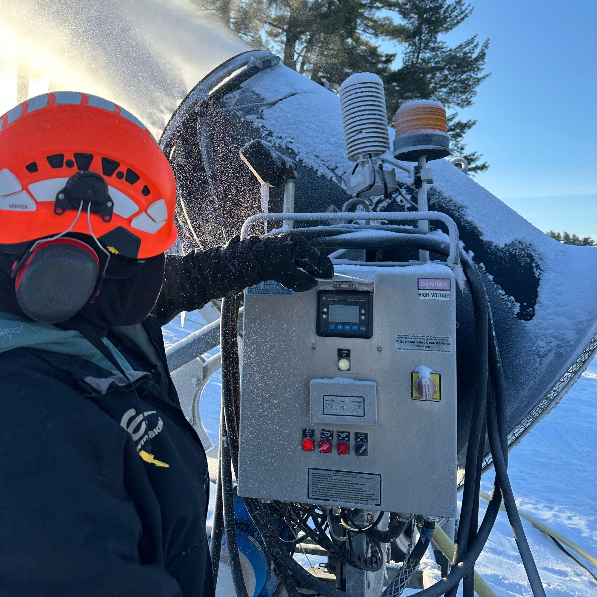 Riley operating the fan gun located on North Slope. Modern fan guns use precision nozzles and automated controls to make more snow using the same amount of energy.