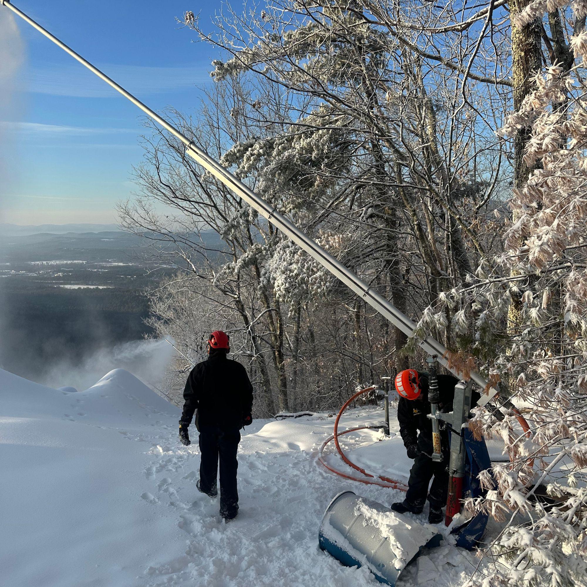 Riley and Jake assessing the snow piles and adjusting snowguns on Koessler. Last year, Cranmore added eight new HKD snow guns.